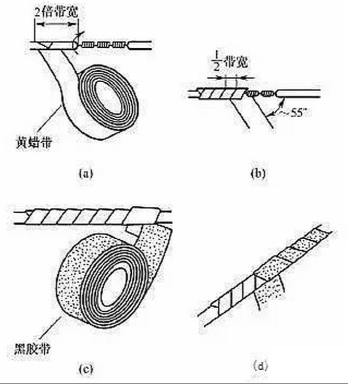 導(dǎo)線連接處的絕緣處理通常采用絕緣膠帶進(jìn)行纏裹包扎。一般電工常用的絕緣帶有黃蠟帶、滌綸薄膜帶、黑膠布帶、塑料膠帶、橡膠膠帶等。絕緣膠帶的寬度常用20mm的,使用較為方便。