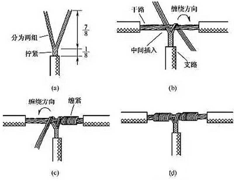 另一種方法如圖8所示,將支路芯線靠近絕緣層的約1/8芯線絞合擰緊,其余7/8芯線分為兩組[見圖8(a)],一組插入干路芯線當(dāng)中,另一組放在干路芯線前面,并朝右邊按圖8(b)所示方向纏繞 4~5圈。再將插入干路芯線當(dāng)中的那一組朝左邊按圖8(c)所示方向纏繞4~5圈,連接好的導(dǎo)線如圖8(d)所示。